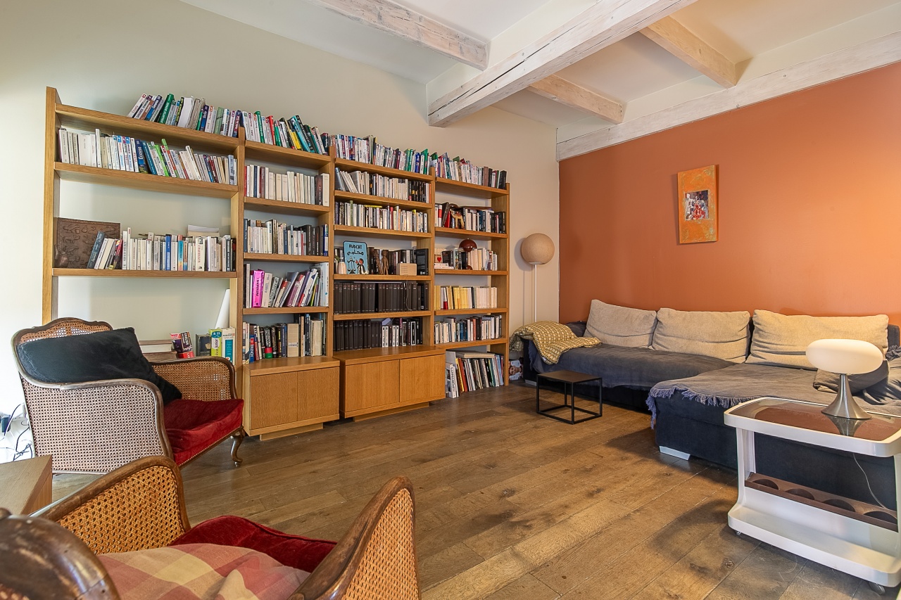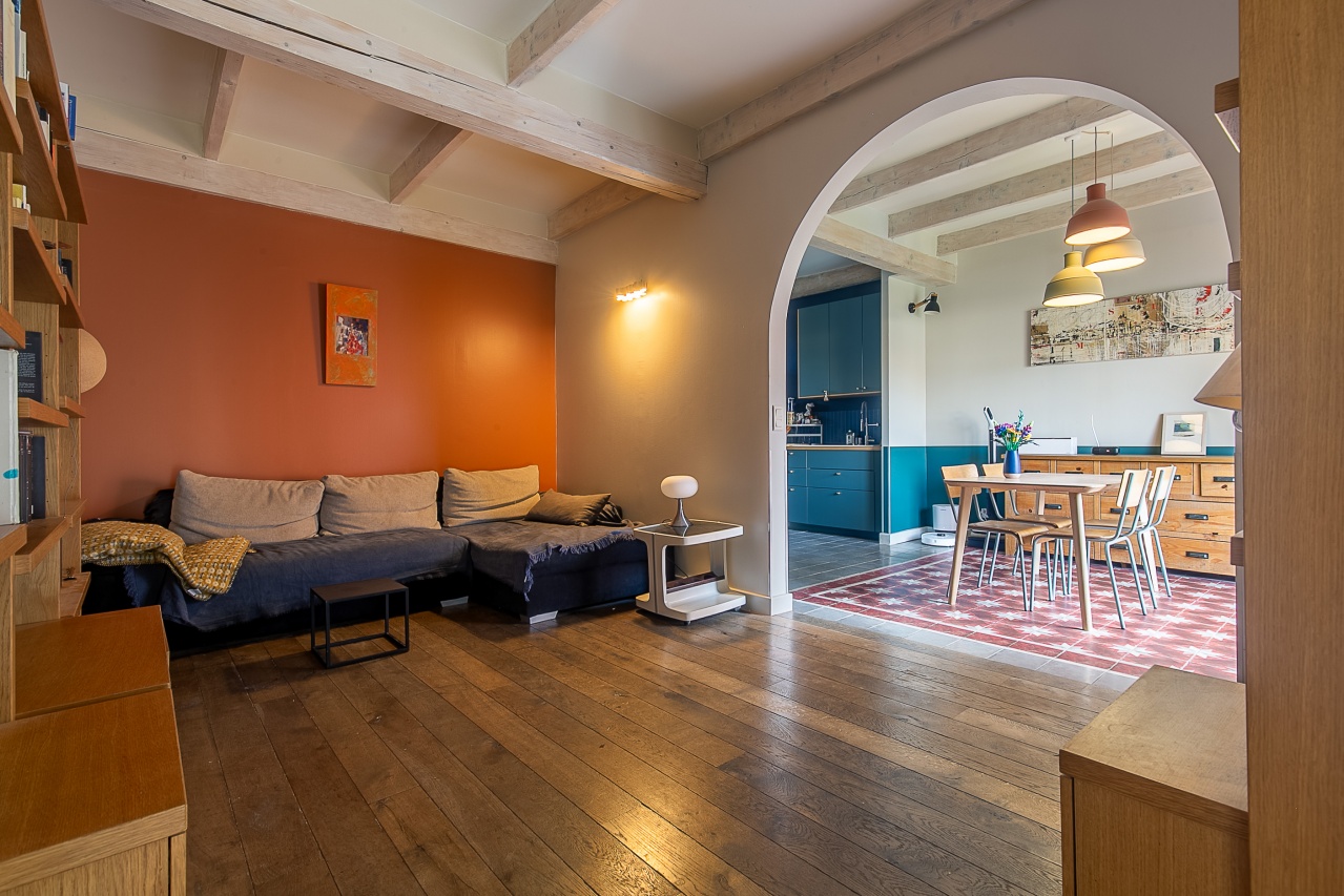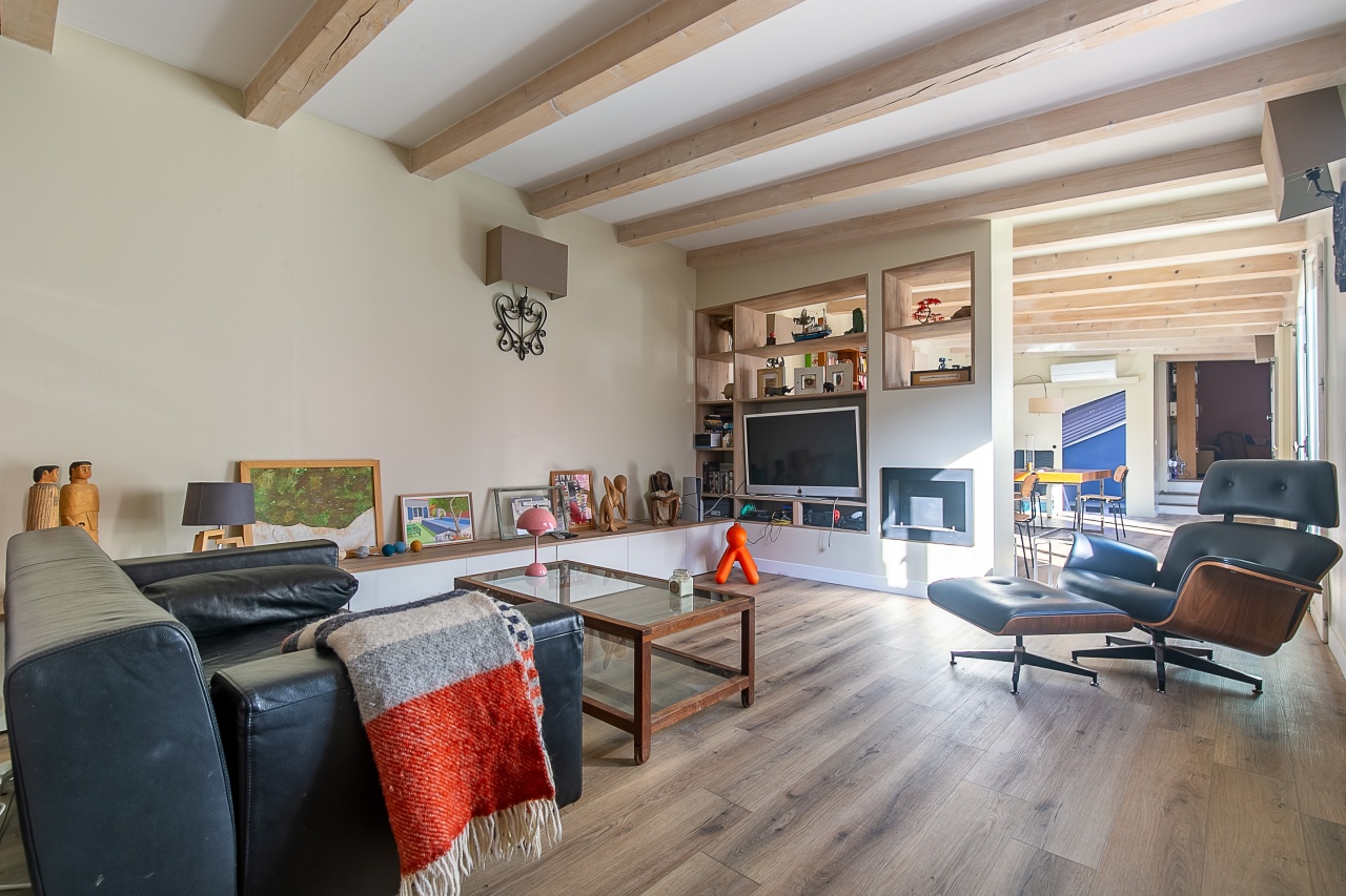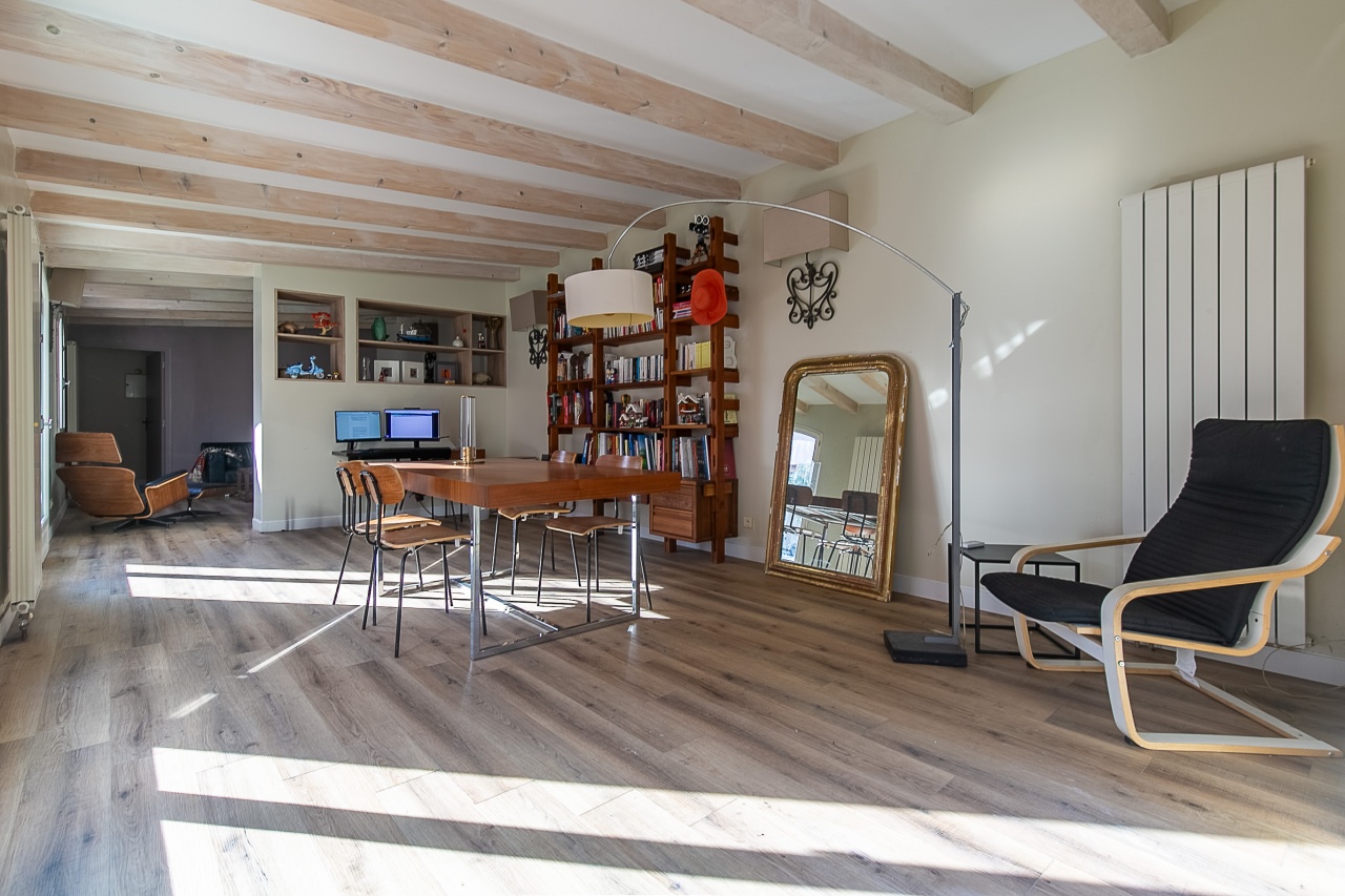 - Poutres apparentes et parquet massif conférant à l'ensemble un caractère authentique et chaleureux.