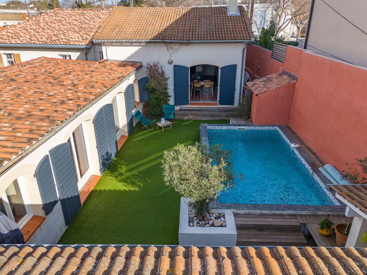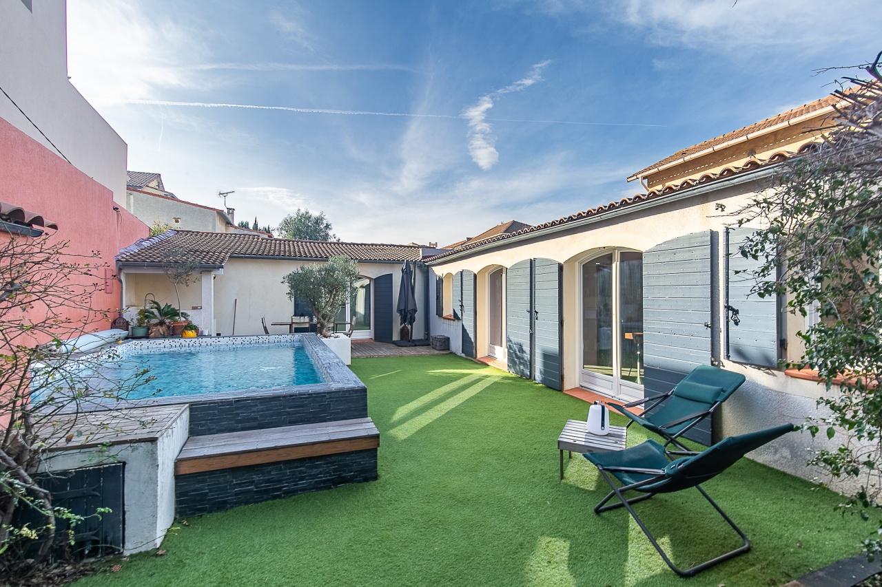 Le jardin est agrémenté d'une piscine et d'une cuisine d'été.